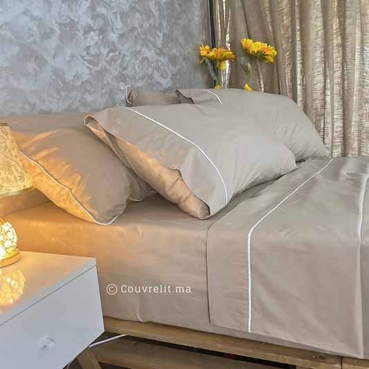 Ensemble Housse de couette Satin de Soie 100% Cotton | BEIGE Avec passepoil blanc Ref: CV0168