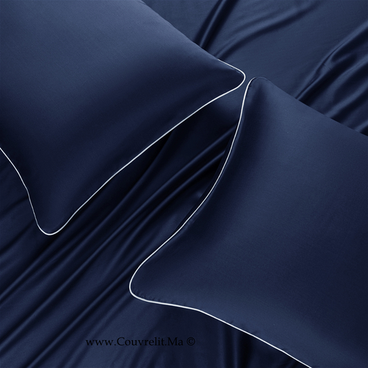 SILK Taie D'oreillers en Soie Avec Band Blanc - BLEU MARIN