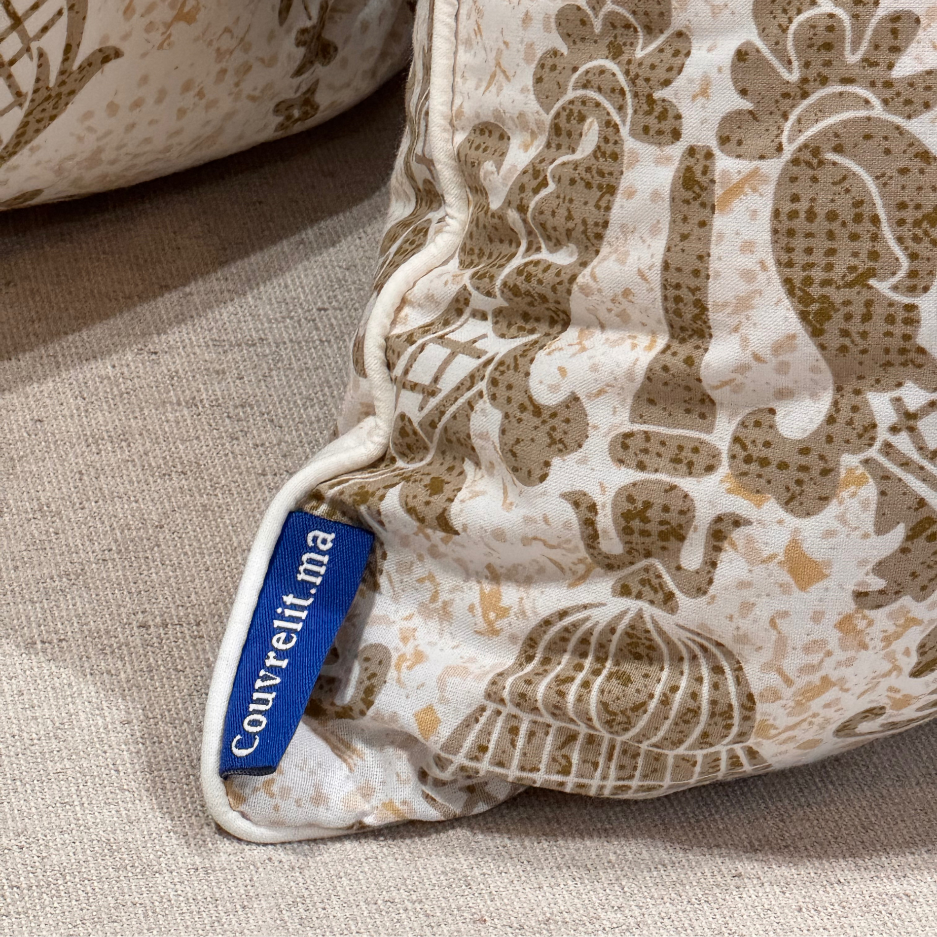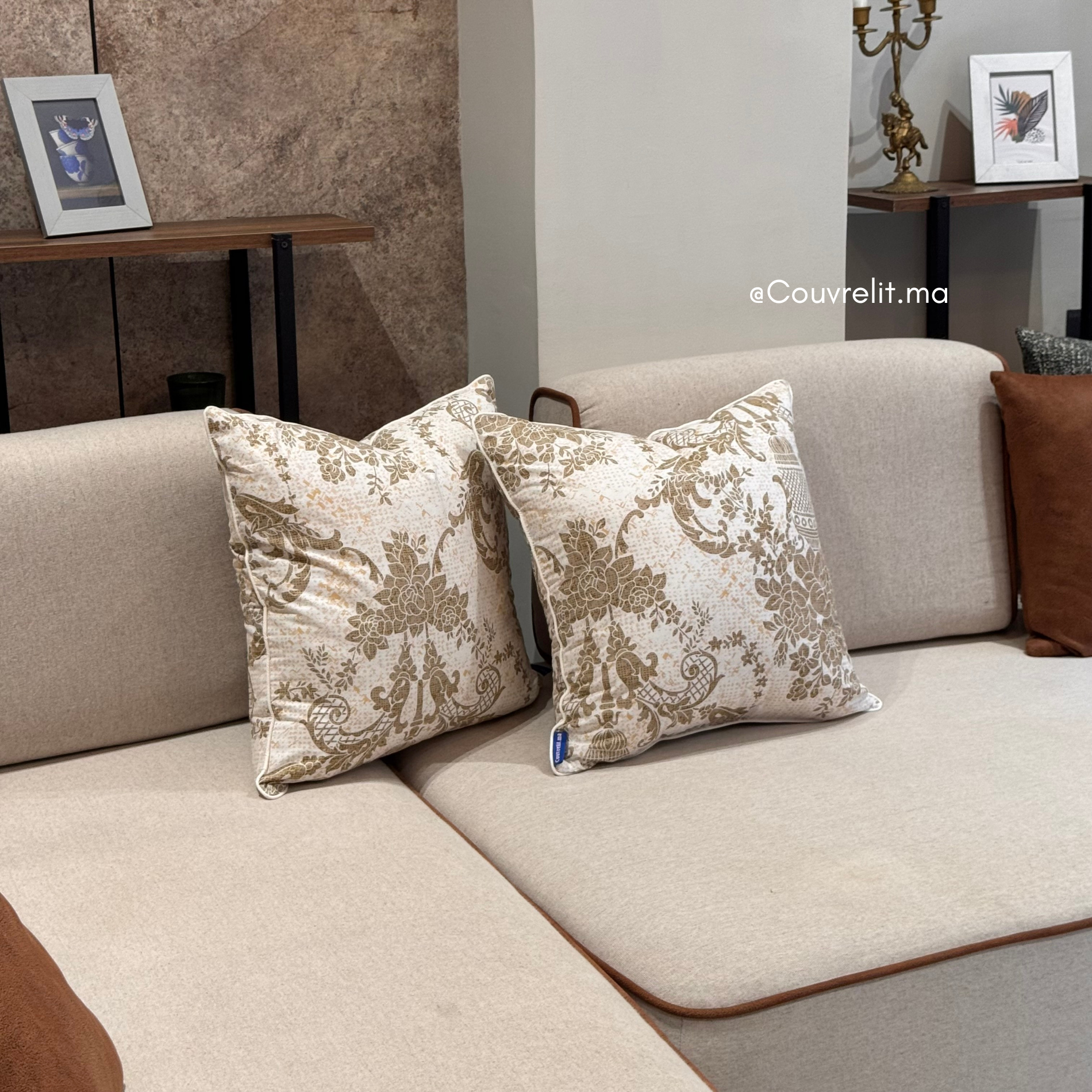 Un coussin au charme intemporel, orné de motifs floraux délicats dans des tons beige doré. Parfait pour apporter une touche de douceur et d’élégance à votre intérieur.