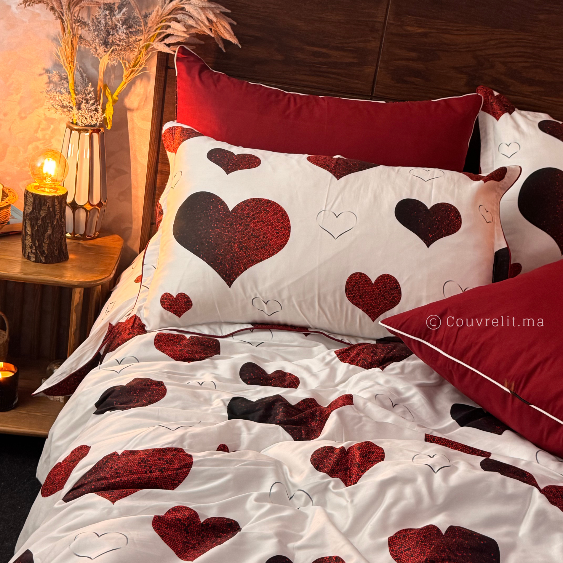 Son motif de cœurs rouge profond apporte une touche romantique et raffinée à votre chambre.